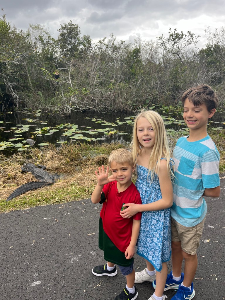 On our family trips, we try to prioritize natural settings and hiking when we can. We wanted to give Everglade National Park a try, and honestly, I wasn’t expecting to see a single alligator. We drove and parked at Shark Valley Visitor Center and we opted out of the tram ride and said yes to a two mile hike. As we started on the path, we saw alligators on all sides relaxing in the swamp! We counted 30! total. They were right next to us, and after we passed a few, we realized they were content and we could safely view them from the path with confidence. We also saw various species of birds, plants, and flowers. The visitor center gave the kids wonderful information and the kids left with souvenirs and their first gator spotting experience!